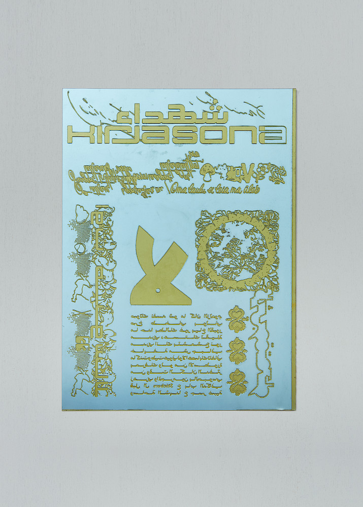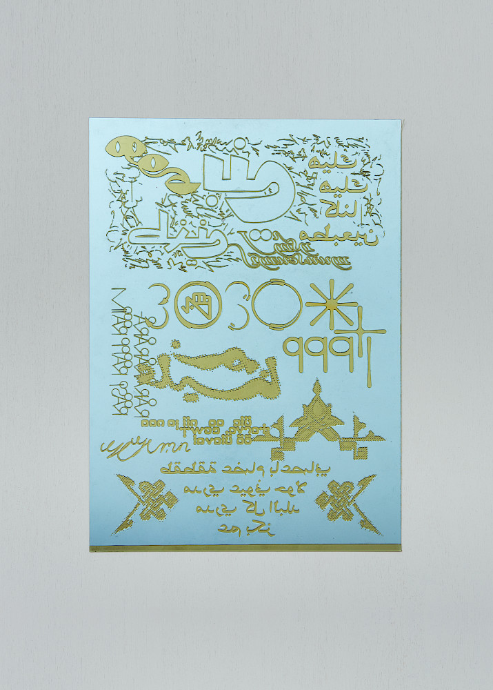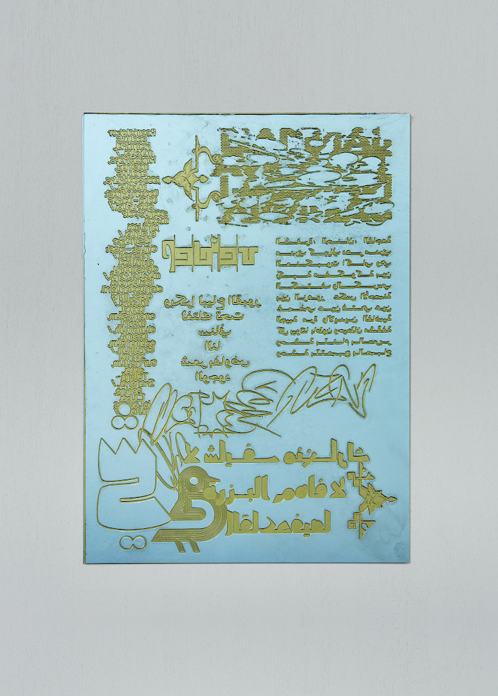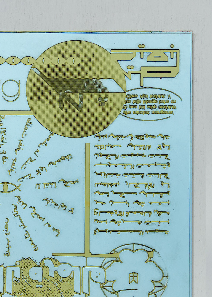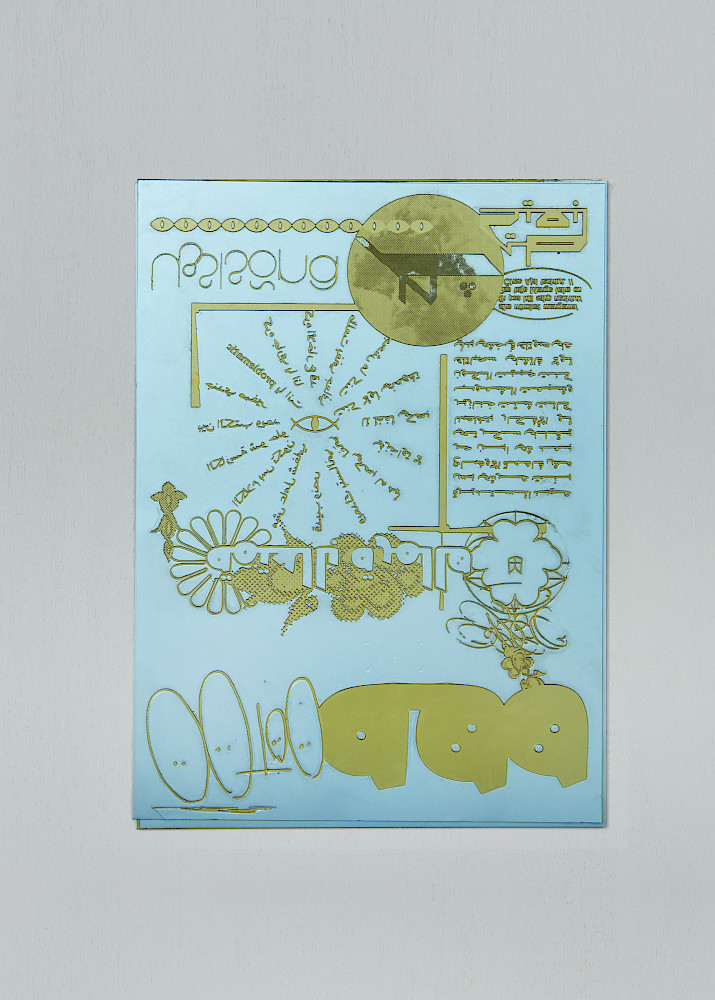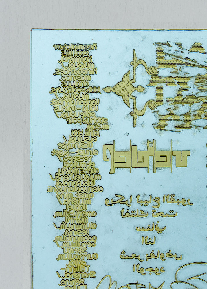 Ott Metusala and Farah Fayyad, who contribute to the Exhange Room by invitation of the Initiator, utilised the printing sheet as an stage for the encounter between different cultural backgrounds. Hereon, a modular layout enables the well constructed typographic brickwork that is reproduced by means of reliefprint that makes a reference to the traditional craftsmanship of carving letters into religious sights.