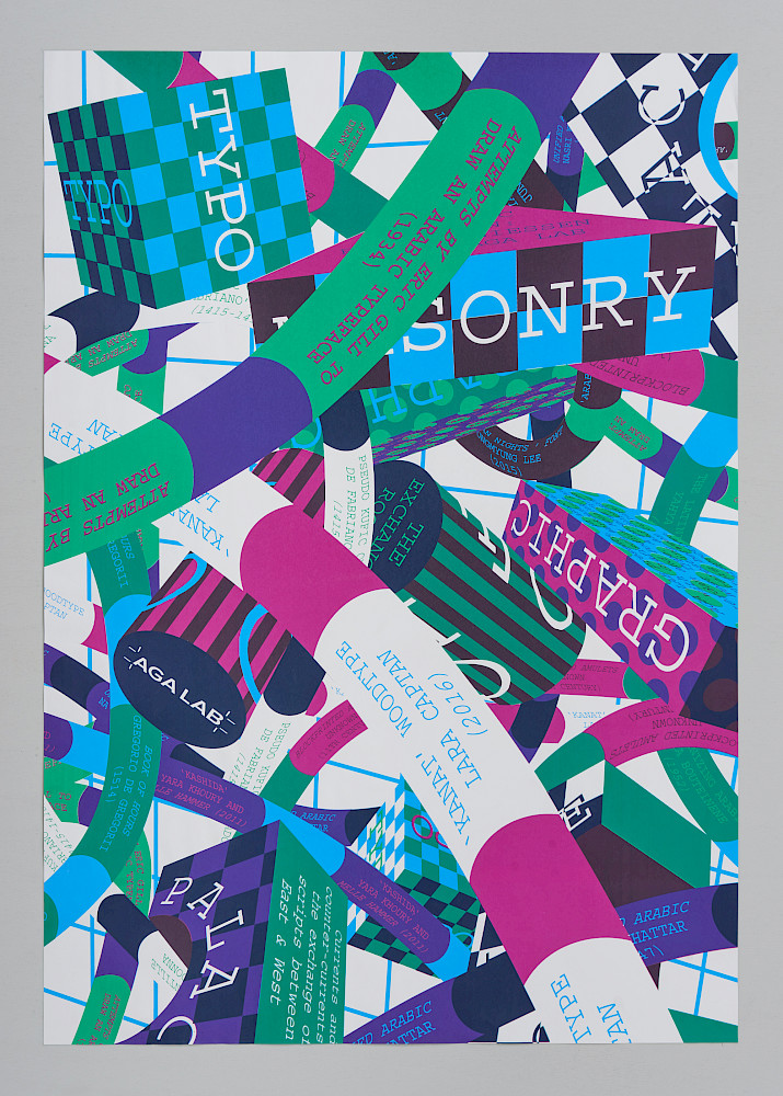 The poster of The Exchange Room is part of a poster series for the building’s Bulletin Board: forming the announcements introducing each section of The Palace of Typographic Masonry. This section consists of a wickerwork of connecting cables, stretching far and wide beyond cultural, temporal, and geographical conditions. Like other announcements, the poster is silkscreen printed in a set of three colours – green, cyan and purple – which through overlap and transparency produces a vast array of mixed colours.