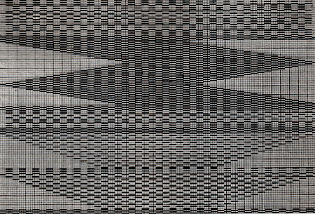 In the Jacquard machine, patterns are programmed upon cardboard cards with small punched holes. A string of these ‘punch cards’ run through a mechanism controlling which warp threads should be raised in order to allow the weft thread to pass under. Written in a binary code of open and closed holes, each punch card held the instructions for a specific weaving pattern. Although Jacquard’s use of punch cards to direct the weaving process marked a big leap in the development of the loom (and consequently the production of patterned textiles), people have used binary code to visualise and translate pattern designs since the earliest of days; take for instance the gridded cartoons with black and white squares representing the over and under movement of the weft. These ‘coded’ pattern drawings show that abstract mathematical thinking has been elementary to the craft of (hand)weaving long since Jacquard introduced pattern software in the shape of punch cards.