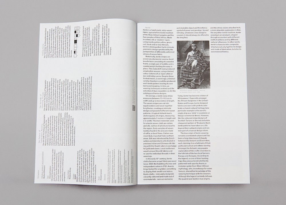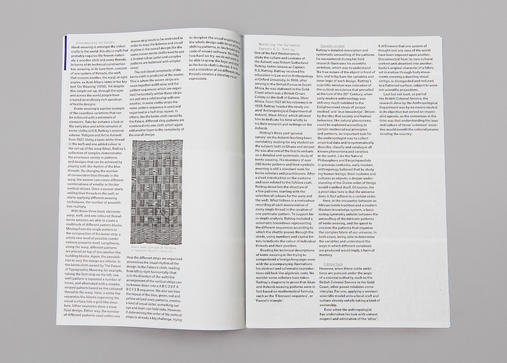 On palatial commission, RNDR was invited to respond to the visual vocabulary of the patterns in The Veranda of Floating Threads. Here, the rhythms and variation in the complexity of the interweaving patterns of the Kente, formed the point of departure for an exploration in creative coding to find new possibilities of visual communication. This resulted in ‘Coding Kente,’ a set of ‘test strips’ that transform the letters and words of the accompanying essay into a visual arrangement, motif and order.