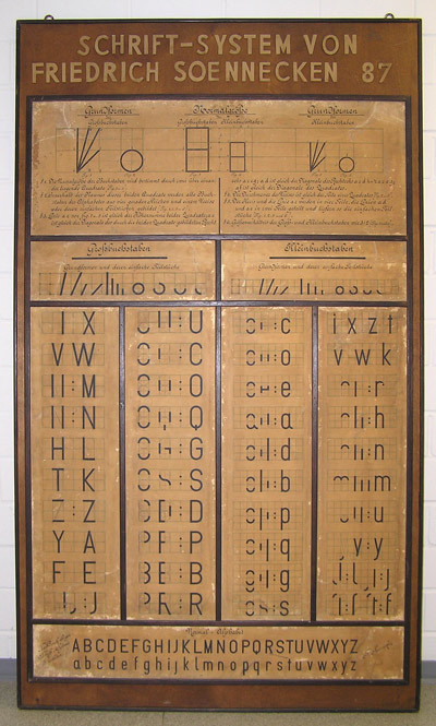 Friedrich Soennecken developed a construction kit for uppercase letters for primary school children in 1913. Soennecken had been inspired by the pedagogue Froebel, who worked with building blocks based on the elementary shapes sphere, cube and pyramid. As a logical continuation Soennecken developed a writing system based on lines and circles. With his construction kit the children composed the characters from a set of straight and circular metal elements. An underlying grid helped the children to position the elements.