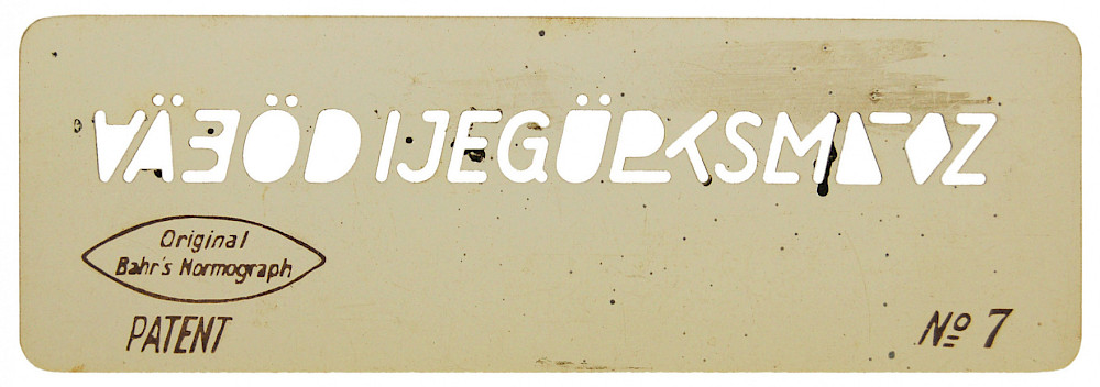 When uniformity in design is key the most basic means of ensuring homogenous letterforms is a lettering guide template, or stencil. The Normograph was invented by vocational school teacher Georg Bahr and was patented in Germany in 1909. It did not contain a full character set, but only a few elementary shapes — stems, arms, curve segments, diagonals — that needed to be combined into letters and numerals. Contemporary guides by most other manufacturers were equally limited.