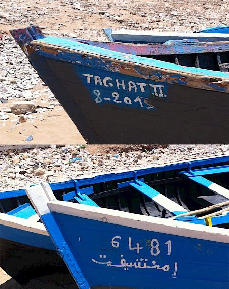 Boats in Tagazouth (Morocco) with Amazigh names written in Latin and Arabic alphabets.