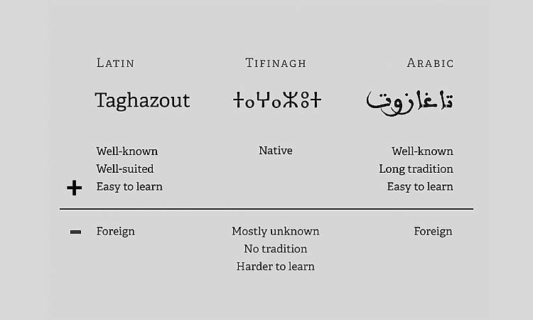 The selection of the Tifinagh alphabet over the other two prevalent writing systems, namely Arabic and Latin, was motivated by considerations of identity rather than utility, as illustrated in the diagram. This decision sparked intense controversy, which in some areas continues to this day.