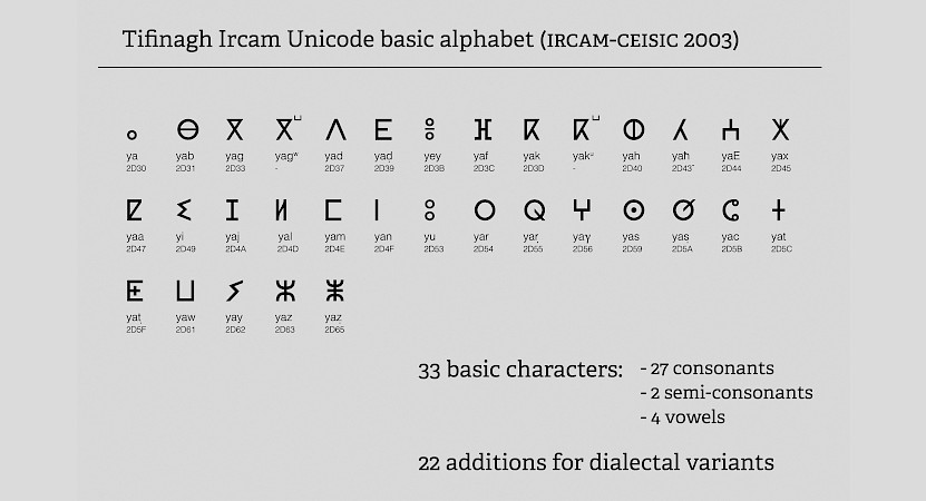 Based on the alphabet used by the Tuareg in the Ahaggar region, the proposed alphabet dropped the less commonly-used characters and added four new characters for vowels. This alphabet, named Neo-Tifinagh, served as inspiration for the first attempt to establish global standards for both the Amazigh language and the Tifinagh script by the Royal Institute of the Amazigh Culture (IRCAM) [11] in Morocco.