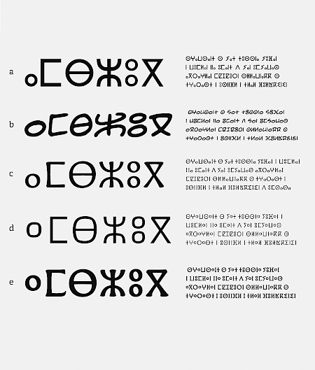 Some Tifinagh typefaces: a) Tifinagh Ircam Unicode. 2003. IRCAM; b) Tifinaghe Anafaw. 2013. IRCAM; c) Amaikha Tifinagh. 2014. J.L. Blanco; d) Tubqal. 2017. A. Balius, S. Bellizi, J.L. Blanco; e) Qandus. 2017. J.L. Blanco, L. Meseguer, K. Sarkis.