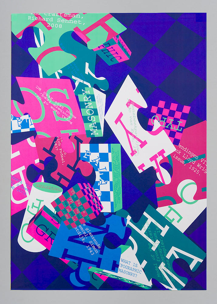 The poster of The Masonic Lobby is part of a poster series for the building’s Bulletin Board: forming the announcements introducing each section of The Palace of Typographic Masonry. For the lobby, its visual translation consists of the various puzzle-pieces from which the structure of the building can be constructed. Like the other announcements, the poster is silkscreen printed in a set of three colours, pink, mint green, and cyan, which through overlap and transparency produces a vast array of mixed colours.